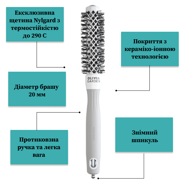 Ceramic Ion Thermal Brush торгової марки Olivia Garden недарма користується популярністю серед майстрів. Технологія турмалін-іонного напилення знижує статичну електрику волосся, при цьому шар кутикули кожного волоска буде закритий, що запобігає пересушуванню волосся.