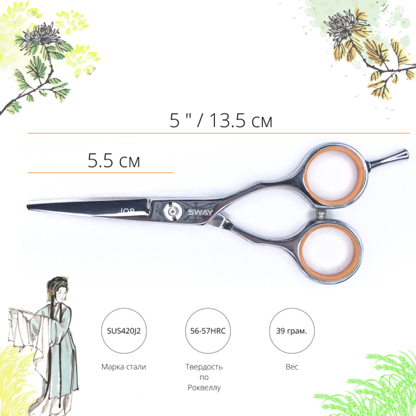 Ножиці серії Job від торгової марки Sway – це традиційні відчуття при стрижці завдяки класичному дизайну. Регульована гвинтова група та полірування до дзеркального блиску забезпечать м'який та плавний хід. Професійні ножиці серії Job є однією з базових серій ножиць для початківців.