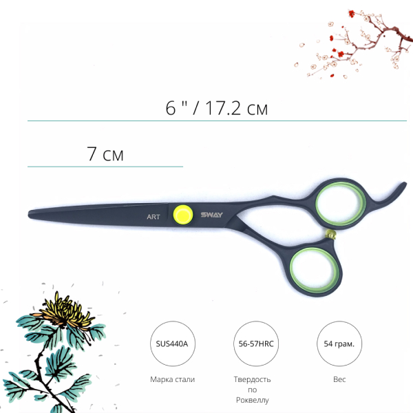 Sway Art - це моделі перукарських ножиць в ексклюзивних кольорах, з тефлоновим або титановим покриттям, та антиалергенним захистом стійким до стирання. Виготовляється з високоякісної нержавіючої сталі марки SUS440A з твердістю за Роквеллом 56-57 HRC.
