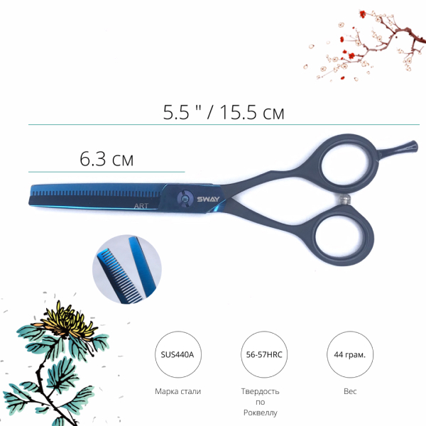Sway Art - це моделі перукарських ножиць в ексклюзивних кольорах, з тефлоновим або титановим покриттям, та антиалергенним захистом стійким до стирання. Виготовляється з високоякісної нержавіючої сталі марки SUS440A з твердістю за Роквеллом 56-57 HRC.