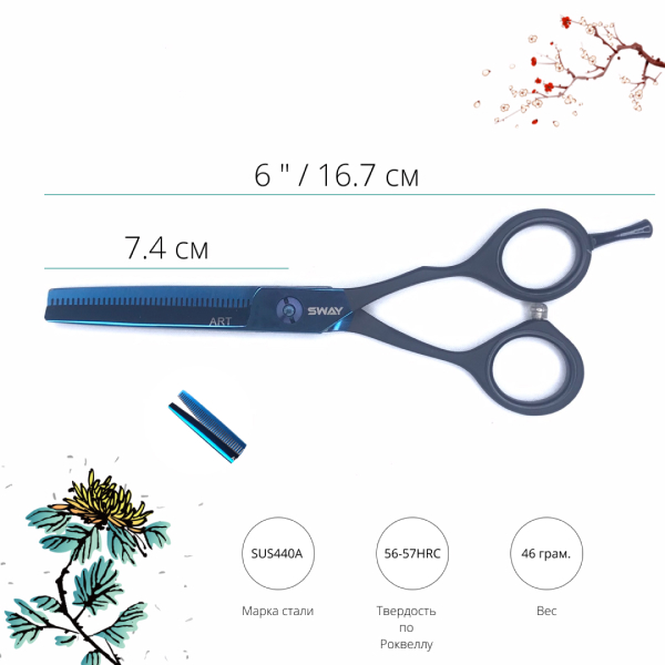 Sway Art - це моделі перукарських ножиць в ексклюзивних кольорах, з тефлоновим або титановим покриттям, та антиалергенним захистом стійким до стирання. Виготовляється з високоякісної нержавіючої сталі марки SUS440A з твердістю за Роквеллом 56-57 HRC.