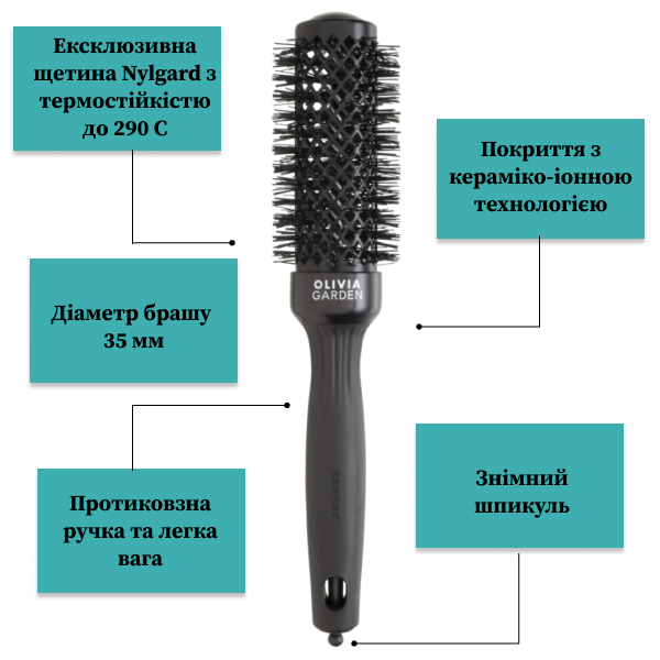 Ceramic Ion Thermal Brush торгової марки Olivia Garden недарма користується популярністю серед майстрів. Технологія турмалін-іонного напилення знижує статичну електрику волосся, при цьому шар кутикули кожного волоска буде закритий, що запобігає пересушуванню волосся.