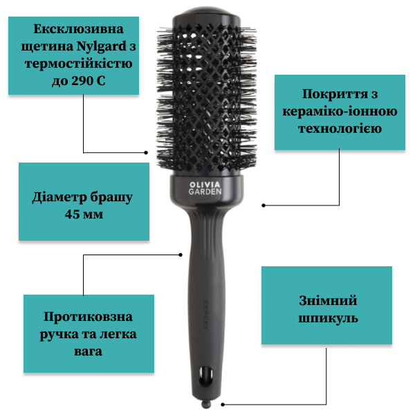 Ceramic Ion Thermal Brush торгової марки Olivia Garden недарма користується популярністю серед майстрів. Технологія турмалін-іонного напилення знижує статичну електрику волосся, при цьому шар кутикули кожного волоска буде закритий, що запобігає пересушуванню волосся.
