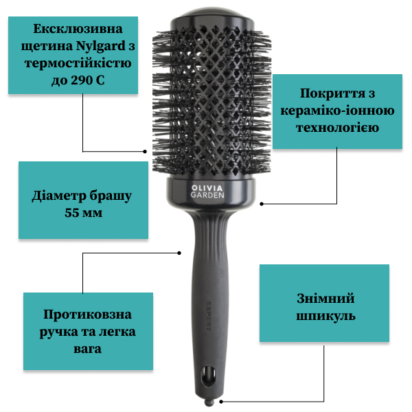 Ceramic Ion Thermal Brush торгової марки Olivia Garden недарма користується популярністю серед майстрів. Технологія турмалін-іонного напилення знижує статичну електрику волосся, при цьому шар кутикули кожного волоска буде закритий, що запобігає пересушуванню волосся.