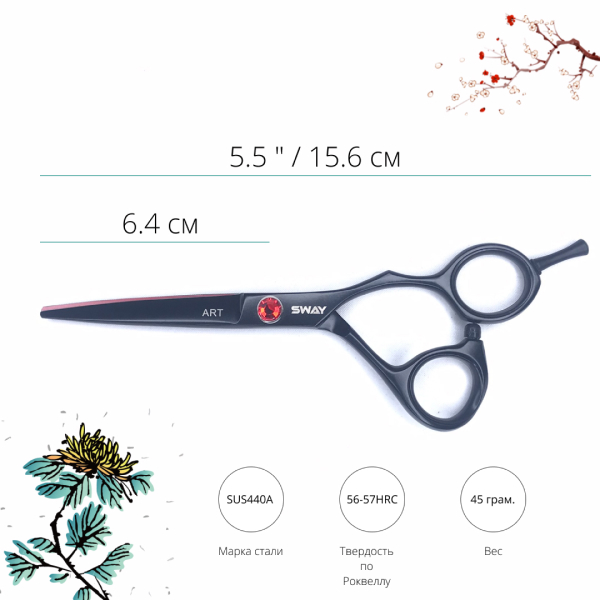 Sway Art - це моделі перукарських ножиць в ексклюзивних кольорах, з тефлоновим або титановим покриттям, та антиалергенним захистом стійким до стирання. Виготовляється з високоякісної нержавіючої сталі марки SUS440A з твердістю за Роквеллом 56-57 HRC.