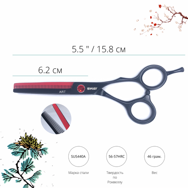 Sway Art - це моделі перукарських ножиць в ексклюзивних кольорах, з тефлоновим або титановим покриттям, та антиалергенним захистом стійким до стирання. Виготовляється з високоякісної нержавіючої сталі марки SUS440A з твердістю за Роквеллом 56-57 HRC.