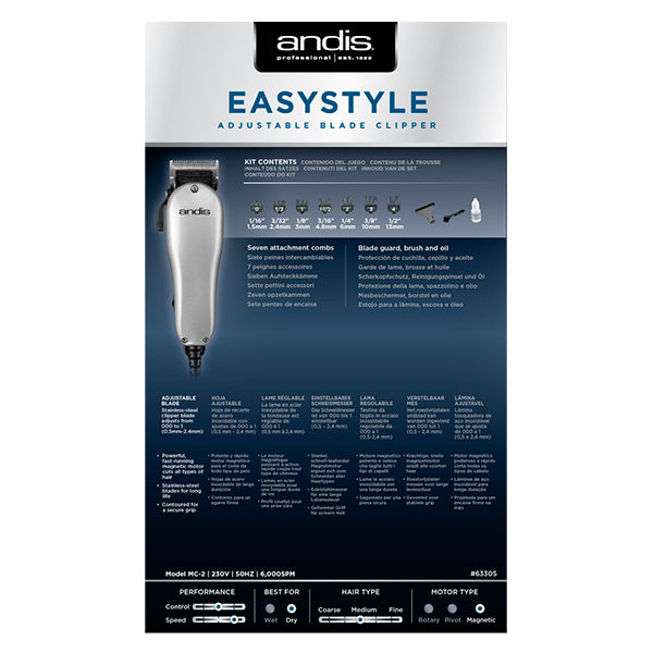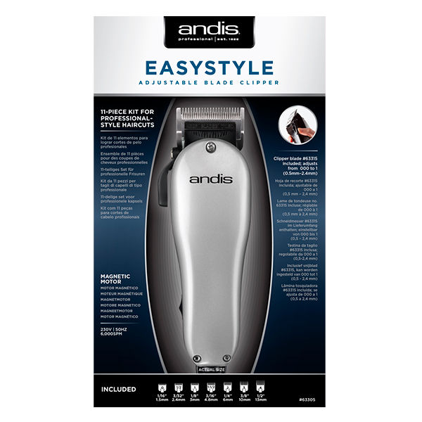 Easystyle - це професійна машинка для стрижки, універсальне рішення для перукарів початківців. Машинка має півотний тип двигуна й потужність 10 Вт, яка дозволить впорається з середнім потоком людей в салоні, або зі стрижкою вдома. При своїх габаритах, машинка має дуже низький рівень вібрації, і шуму. Завдяки ергономічній рукояті зручно лежить в руці, і полегшує роботу майстра. Система регулювання ножового блоку дозволить Вам виставити потрібну висоту зрізу від 0,5 до 2,4 мм. Ножовий блок виготовлений з високотехнологічної легованої сталі, що своєю чергою виключає перегрів при тривалому використанні. Для зручності, в комплект поставки входить 5 насадок, з найбільш затребуваною висотою зрізу: 1,5; 3; 6; 10; 13 мм. Свободу дій забезпечить міцний шнур довжиною 1,8 м, а за допомогою кільця для підвішування, Ви зможете зручно розмістити машинку на робочому місці. Професійна машинка для стрижки Andis Easystyle має всі необхідні технічні характеристики!