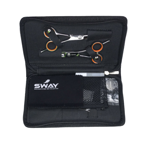 Цей сет чудовий вибір для новачка-перукаря. Набір відповідає всім базовим вимогам щодо якості сталі та заточування. Приємним доповненням до набору стане фірмовий чохол від торгової марки Sway. Стильний, чорний чохол стане відмінним місцем для зберігання ножиць, а також здатний вмістити набір дрібних аксесуарів завдяки сітчастій кишеньці всередині.