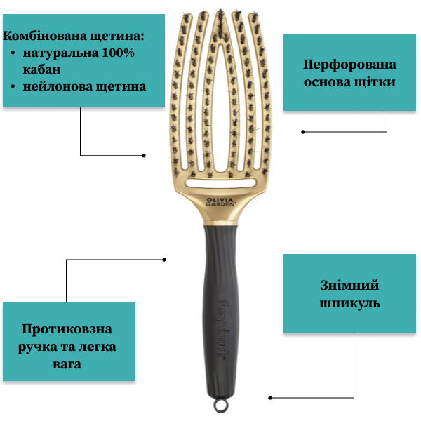 При регулярному використанні щітки Ваше волосся набуде природного блиску і незвичайної шовковистості. Створити ідеальну зачіску в домашніх умовах тепер набагато простіше зі щіткою Finger Brush Trinity Aurelia Gold від торгової марки Olivia Garden.