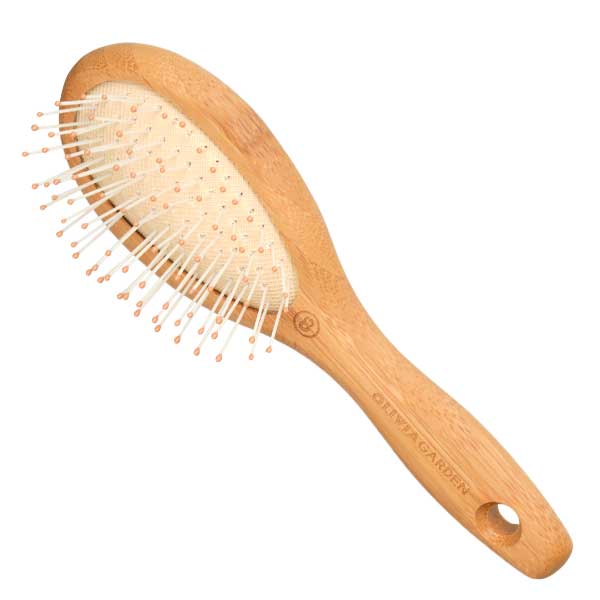 Щітка Bamboo Touch Detangle Nylon повністю виготовлена з екологічно чистого бамбука, який є міцнішим, легшим і довговічнішим, ніж дерево. Гладкий, відполірований матеріал не чіпляє пасм і не дряпає шкіру. Закруглені зубчики роблять розслаблюючий масаж голови, і здатні зняти головний біль. Сучасне іонне покриття забезпечує довге використання інструменту та наявність антистатичних властивостей. Щітка має гарний вигляд. Щітка відмінно підійде для укладання короткого волосся.