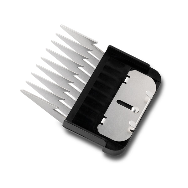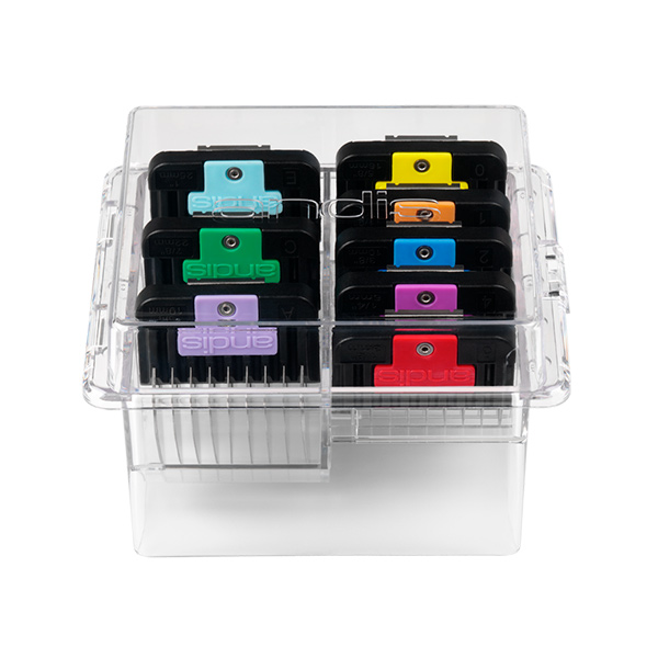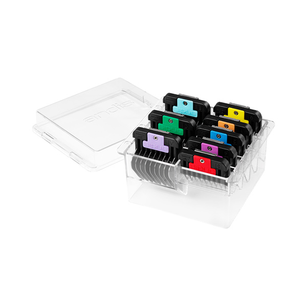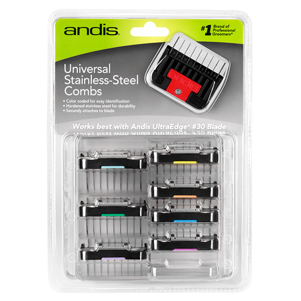 Набір насадок Andis - незамінний атрибут в арсеналі грум-майстра. Кожна насадка виготовлена з високоякісного пластику і нержавіючої сталі що значно підвищує їх надійність і зносостійкість. Жорсткі, сталеві зубці насадки не піддаються деформації під час стрижки та прекрасно борознять брудну, кучеряву, густу і сплутану шерсть на відміну від пластикових аналогів. Всі насадки надійно фіксуються на ножовому блоці за допомогою металевої пружини, яка не дасть зіскочити з ножового блоку під час роботи зі складною шерстю.