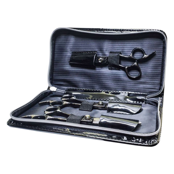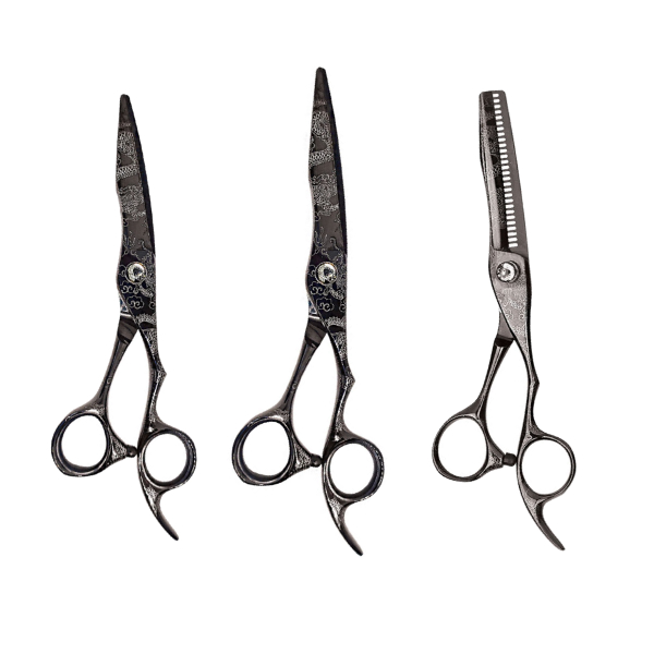 - Набір складається з трьох моделей ножиць: двоє прямих у розмірі 5,5/6,25, і філірувальних у розмірі 6,28 дюймів з однієї серії.