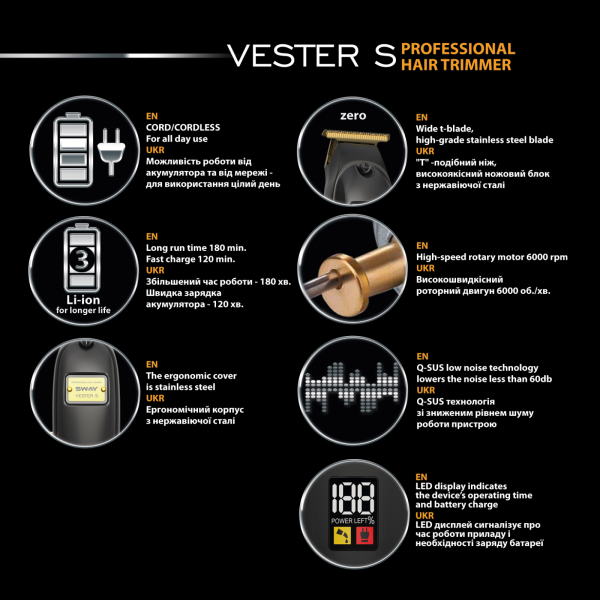 Докладні характеристики тримера Vester S Black And Gold Edition