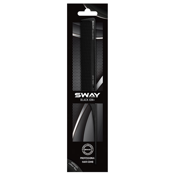 Гребінець зі спицею Sway Black Comb Ion + 112 використовується при роботі з волоссям будь-якого типу і довжини. Зубчики гребінця ретельно відполіровані, завдяки чому не пошкоджують кутикулу волосся і шкіру голови. За допомогою хвостика можна легко і швидко розділити волосся на зони, зробити завивку та укладку. Скорочений перший зубець допоможе легко відокремити потрібну Вам пасмо. Корпус виконаний з міцного і гнучкого карбону з антистатичним ефектом.