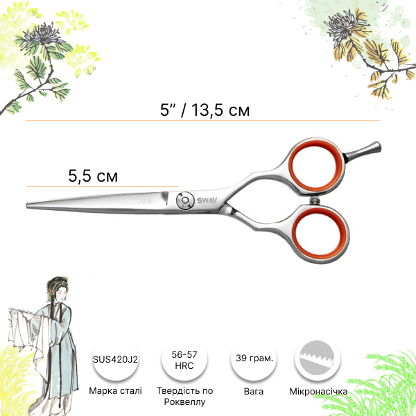 Ножиці серії Job від торгової марки Sway – це традиційні відчуття при стрижці завдяки класичному дизайну. Регульована гвинтова група та полірування до дзеркального блиску забезпечать м'який та плавний хід. Професійні ножиці серії Job є однією з базових серій ножиць для початківців.