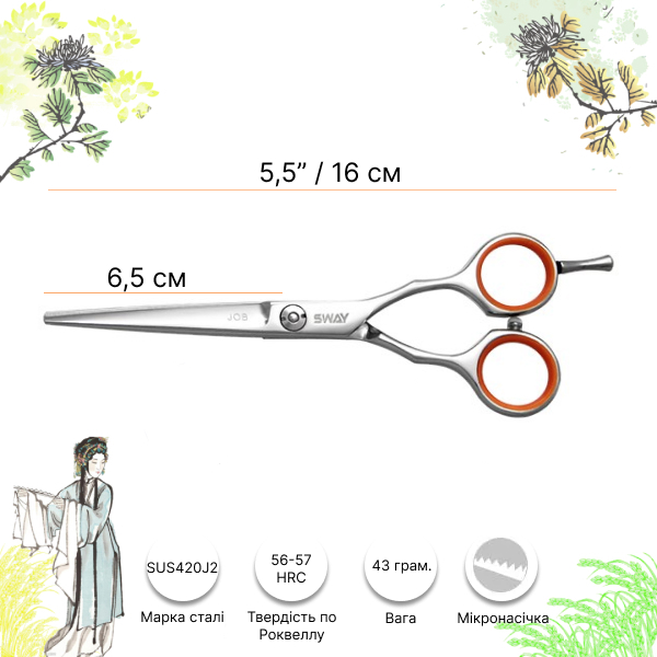 Ножиці серії Job від торгової марки Sway – це традиційні відчуття при стрижці завдяки класичному дизайну. Регульована гвинтова група та полірування до дзеркального блиску забезпечать м'який та плавний хід. Професійні ножиці серії Job є однією з базових серій ножиць для початківців.