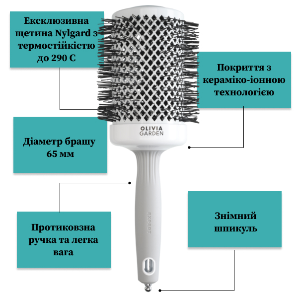 Ceramic Ion Thermal Brush торгової марки Olivia Garden недарма користується популярністю серед майстрів. Технологія турмалін-іонного напилення знижує статичну електрику волосся, при цьому шар кутикули кожного волоска буде закритий, що запобігає пересушуванню волосся.