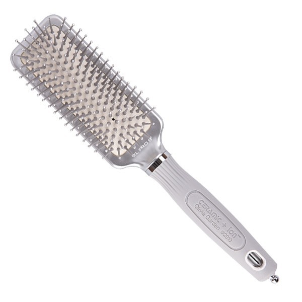Щітка Ceramic + ion XL Pro Large - це ідеальний інструмент для догляду за волоссям на кожен день, який підійде для укладки, причісування, сушки та розплутування волосся. Дана модель має керамічну робочу частину, яка має негативно заряджені електрони, завдяки цьому під час сушіння волосся феном захоплення відбувається набагато краще. Ручка ергономічного дизайну прекрасно збалансована, що сприяє меншій втомі зап'ястя. Також в ручку вмонтовано спеціальний висувний кінчик для проділу прядок.
