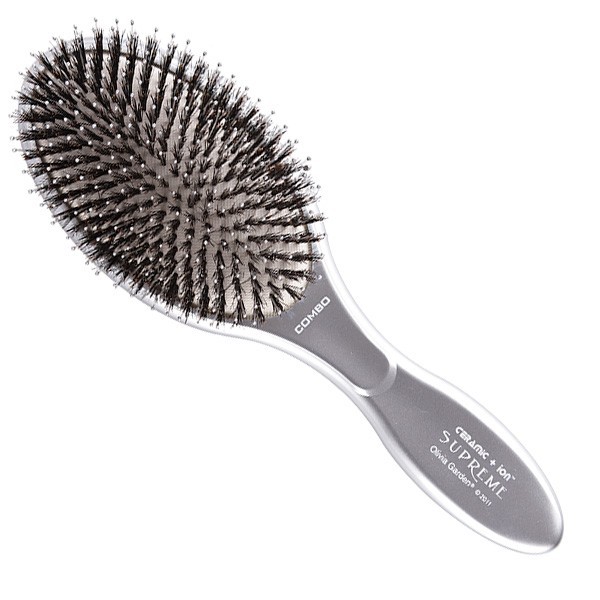 Щітка для щоденного догляду Olivia Garden Supreme Ceramic + ion Combo має стильний дизайн і зручну округлу форму. Унікальна двостороння комбінація щетини з кабана + іон нейлонова щетина дбайливо та акуратно масажує шкіру голови, тим самим стимулюючи ріст волосся. Спеціальні кульки на нейлоновій щетині не травмують шкіру і не виривають волосся. Також щітка знімає електризацію волосся, володіє антибактеріальними властивостями та ідеально підходить для укладки короткого і середнього по довжині волосся. Цей ефект досягається завдяки чергуванню натуральної щетини та гнучких зубчиків. Легка і зручна ручка ідеально лежить в руці.