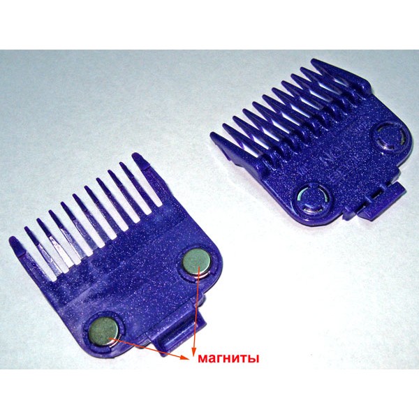 Комплект насадок, який легко встановлюється на ножові блоки машинок торгової фірми Andis, на магнітній основі, має подвійну систему магнітів, гарантовано втримається на ножі. Виготовлені насадки з ударостійкого, термостійкого пластику. Щільно і надійно сідають на ножовий блок.